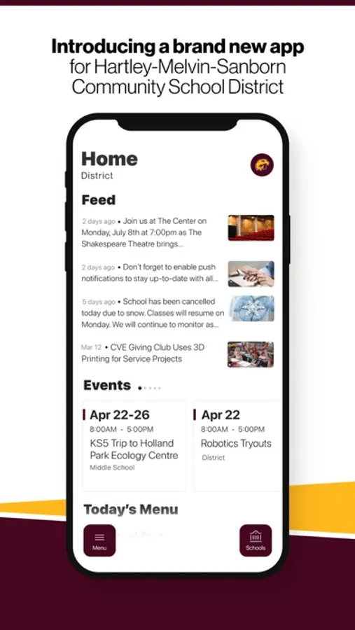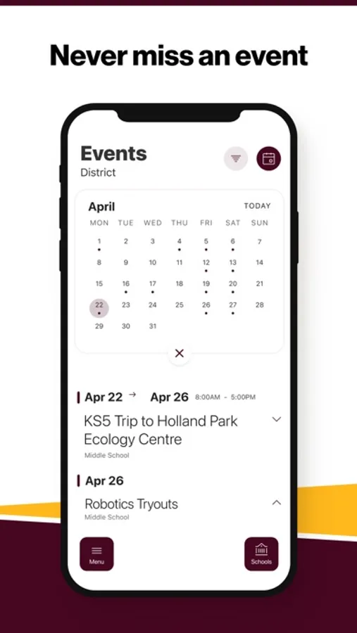 The event section shows a list of events throughout the district. Users can add an event to their calendar to share the event with friends and family with one tap.