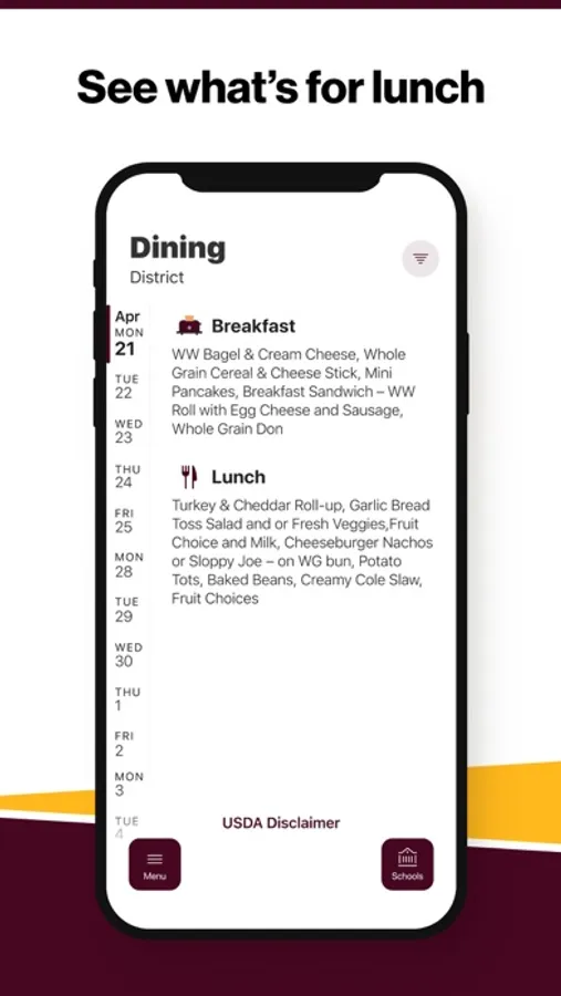 Within the dining section, you'll find an easy to navigate, weekly menu, sorted by day and meal type.