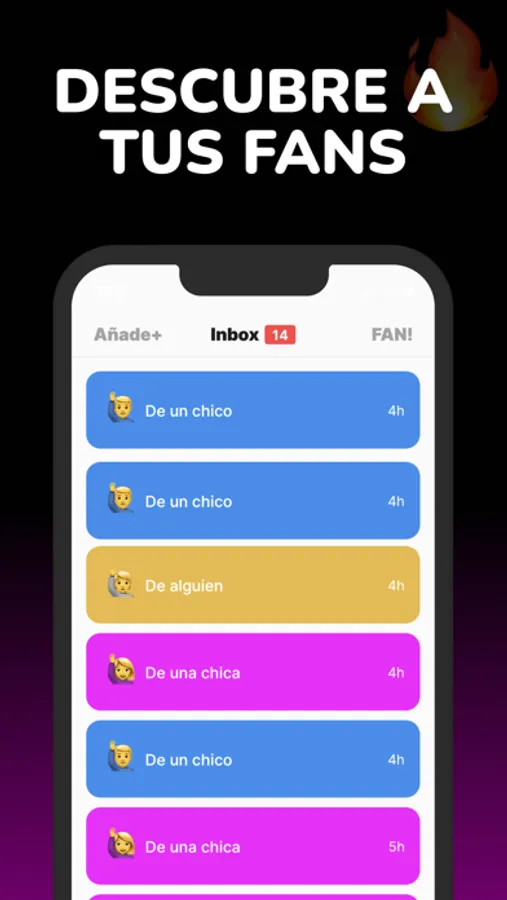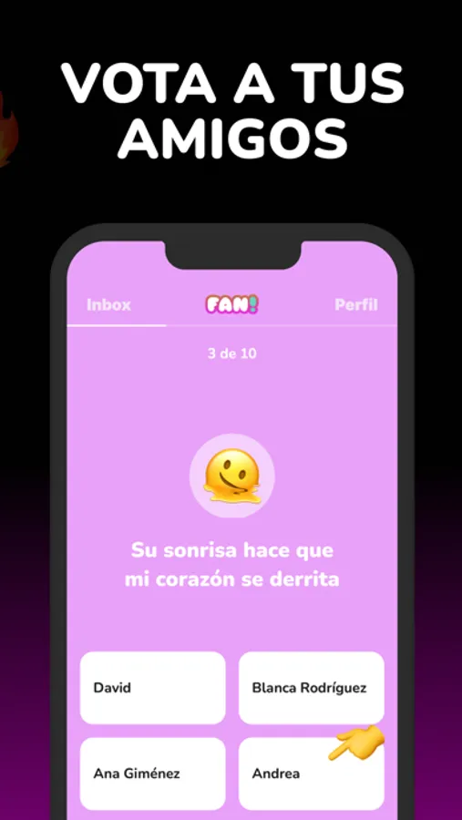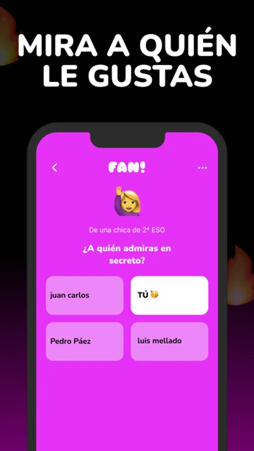 FAN! es la app para votar de forma anónima a tus amigos y descubrir a quién le gustas. Cada día, tendrás que votar en encuestas 100% positivas con tus amigos como protagonistas, a las que tendrás que responder de forma anónima. Cuando hayas respondido a todas, ¡podrás ver quién te ha votado a ti!