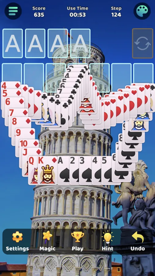 Klondike Solitaire uses a standard 52 card deck of playing cards without jokers. The objective of the game is to expose all cards and move them into the foundation piles. There are 4 foundation piles (one for each suit) that are represented on the screen by an “A“ written on it. These piles are built upward in suit from Aces to Kings.