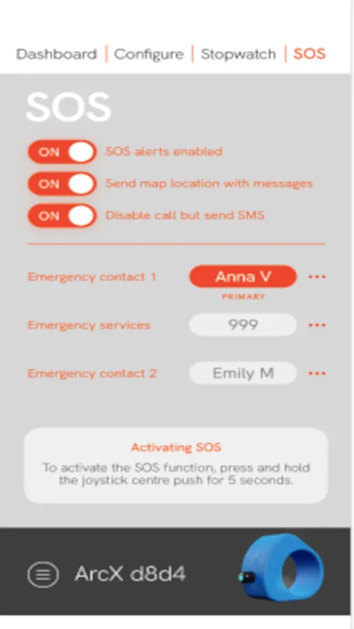 Select your emergency contact. Choose to call, send SMS and map location or all three (outgoing call requires phone screen confirmation). Customise SMS text.