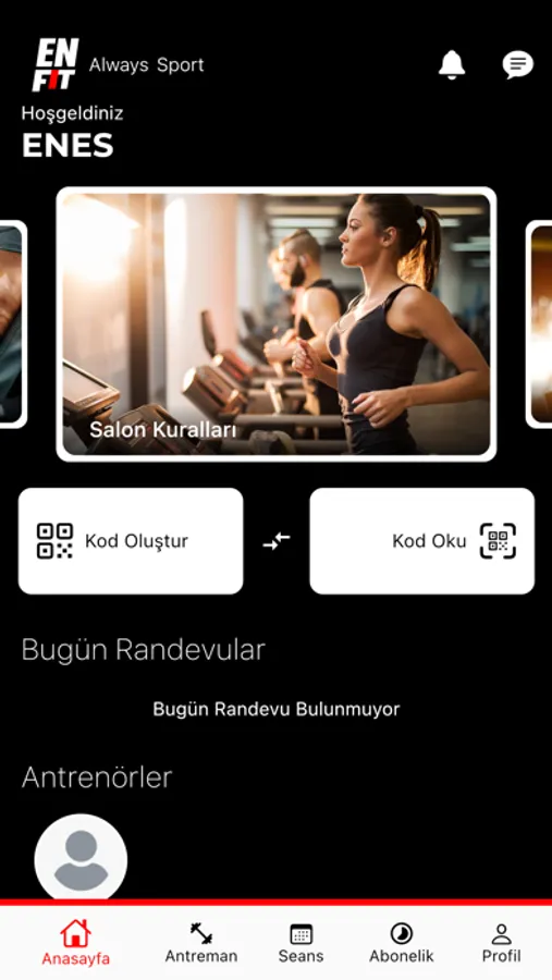 Enfit Fitness Salonu aboneleri mobil uygulamaları sayesinde aşağıdaki işlemleri yapabilir.