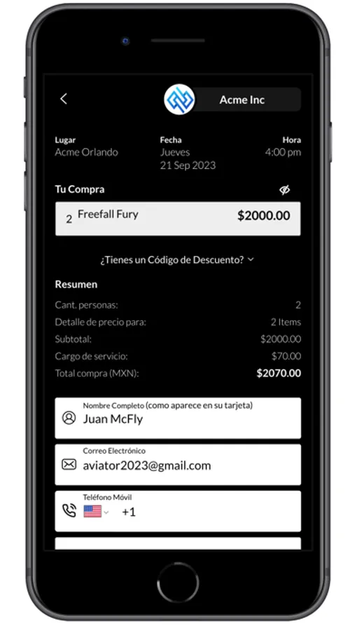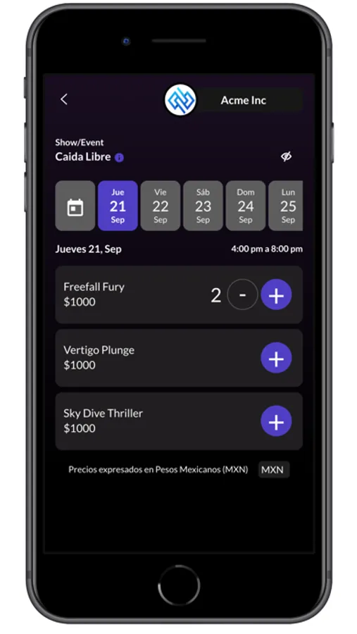 Desde la aplicación podrás ofrecer, seleccionar y cobrar los adicionales habilitados para cada uno de los eventos y categorías de tickets.