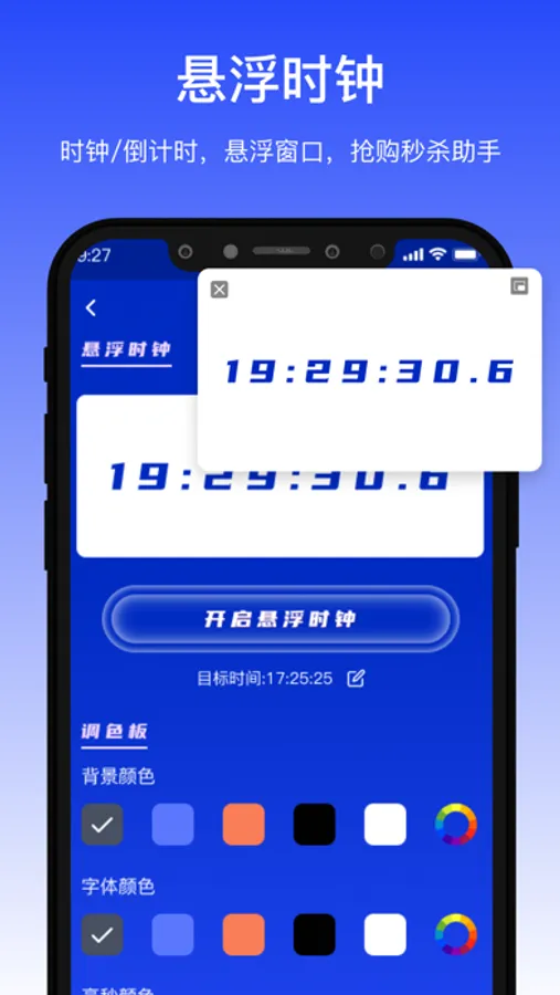 2. 悬浮时钟-无限制的使用悬浮时钟功能,可自由调整时钟颜色,正计时、倒计时模式。通过显示毫秒级的系统时间,使用户在抢购秒杀活动中快人一步,有效提高抢购成功率;