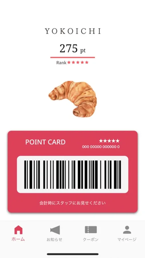 お会計時にホーム画面のバーコードをレジ読み取ることで会計の1%(小数点以下切り捨て)のポイントが貯まります。