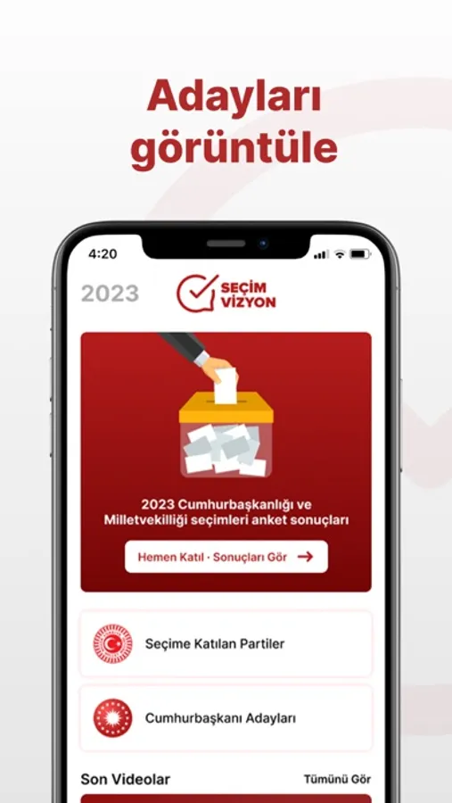 SEÇİM VİZYON, Türkiye'nin ilk dijital seçim bilgi platformudur. 2023 Cumhurbaşkanlığı ve Milletvekili Genel Seçimleri ile ilgili ihtiyacınız olan bilgilerin tamamını bu uygulamada bulacaksınız. En geniş katılımlı siyasi eğilim anketleri ile siyasetin nabzını tutacak; hem Türkiye genelinde, hem de il/ilçe bazında anket sonuçlarını anlık olarak göreceksiniz.