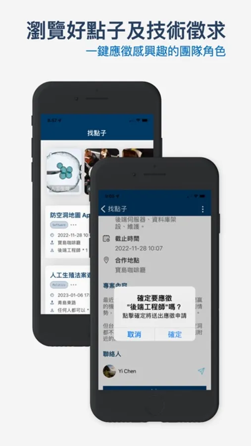 適合擁有技術或想尋找適合自己團隊的你,你可以在這裡看到其他人發佈的貼文,看看是否有自己感興趣的主題、或是需要自己所擁有的技術。若你被標題吸引,可以點進專案看詳細內容,也能在這裡進行一鍵應徵!應徵過的專案都可以在個人頁面入口頁查看。