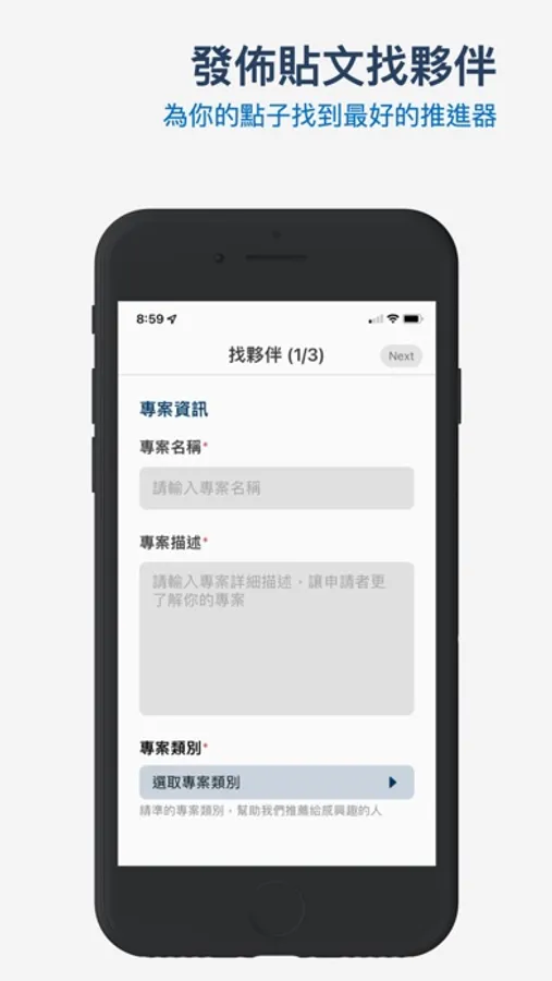 若你擁有一個好點子,但想要實現這個點子,還缺少關鍵技術人才,你可以藉由「找夥伴」發佈貼文,讓擁有技術的人有機會被你的點子吸引,前來與你洽談。記得盡可能簡潔但清楚地描述你的專案內容,並給予精準的專案類別和技能描述,這可以更有效地幫助我們讓你的潛在客群看到你的專案。