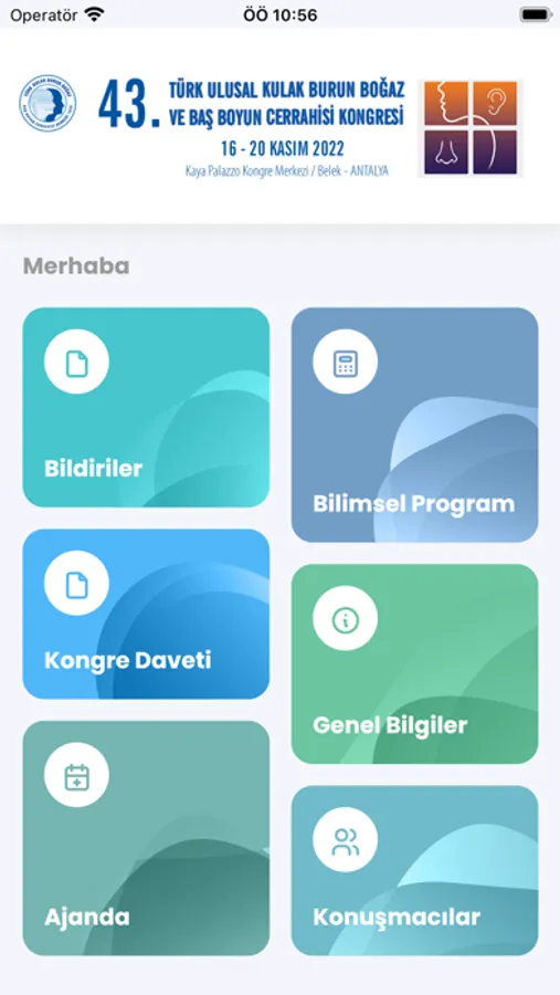 43. Ulusal Kulak Burun Boğaz ve Baş Boyun Cerrahisi Kongresi Resmi iOS Uygulaması ile kongre öncesinde, sırasında ve sonrasında yayınlanan içeriklere, genel bilgilere, bilimsel program, konuşmacı bilgilerine ve detaylarına ulaşabilir, sunum ve bildiri bölümlerinden bildirilerin kısa detaylarını inceleyebilir izin verilen sunumları pdf olarak görebilirsiniz. Anlık bildirimler, duyurular ve favori bölümü ile oturumlardan, öğle ikramları gibi sosyal etkinliklerden haberdar olabilir, anket sistemimiz ile soruları cevaplayabilirsiniz.