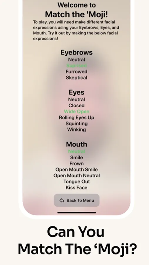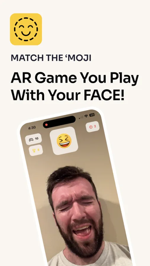 Match the 'Moji is an game played with your face! You will need make different facial expressions using your Eyebrows, Eyes, and Mouth, and match them to the emoji expressions on screen.