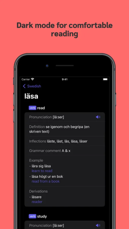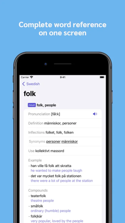 Whether you're a language learner, traveler, or simply looking to expand your vocabulary, Swedish Dictionary has got you covered. With the app, you can look up any Swedish word and see its definition, translation, inflections, examples and idioms, all in one convenient place. And with the pronunciation feature, you can even play and listen to the correct pronunciation of each word, making it even easier to study the language.