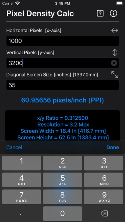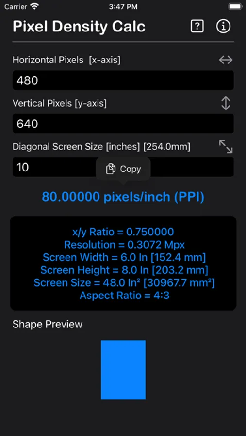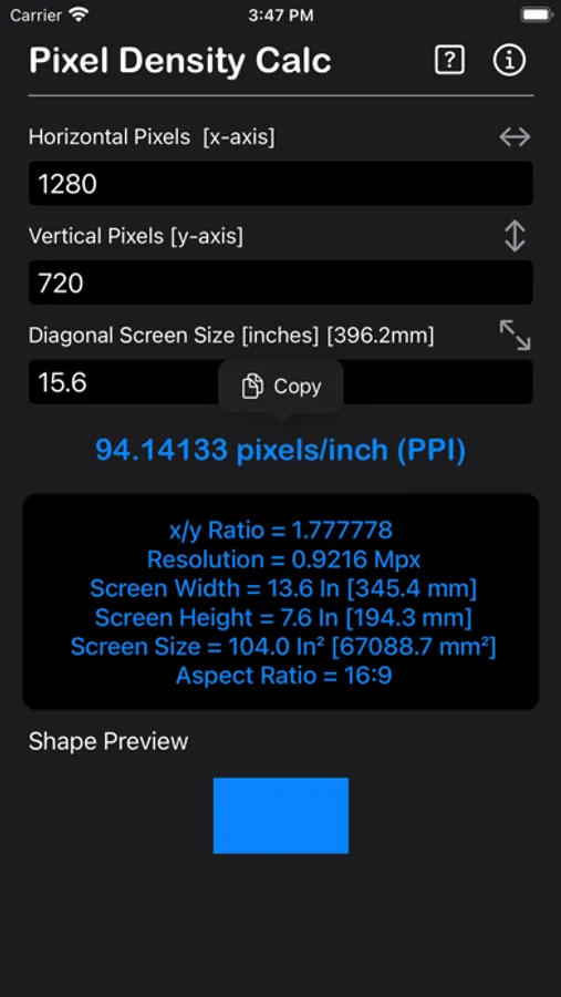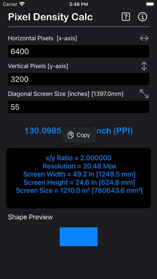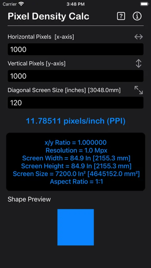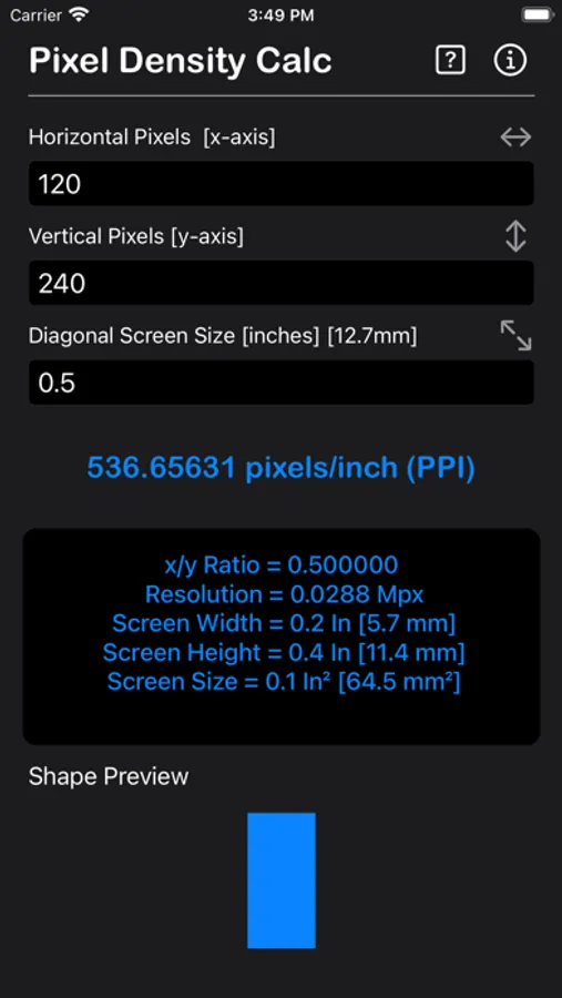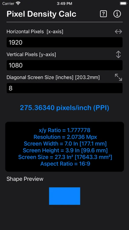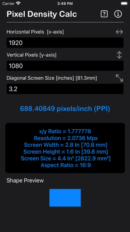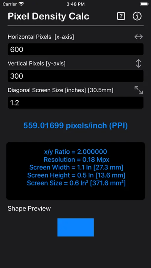 Pixels per inch indicates how many pixels are in a 1 inch line on a display. Also calculated are screen size, screen width, screen height, aspect ratio and total number of megapixels. Calculation including shape preview.