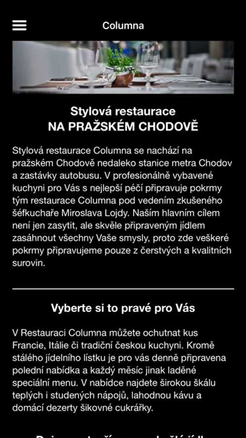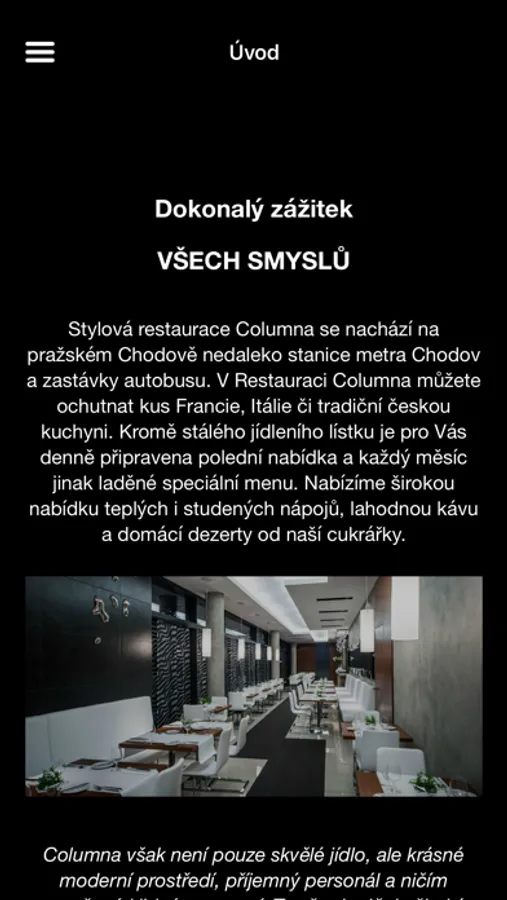 Mobilní aplikace Columna - stylová Restaurace v Praze 4 - Chodov, moderní gastronomie, polední menu, speciální sezónní nabídky, letní grilování, domácí dezerty i široká nabídka českých i zahraničních vín.