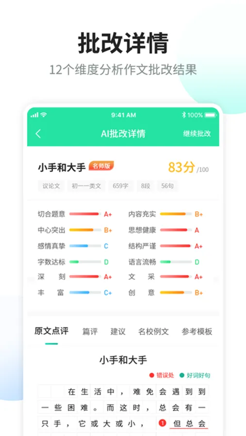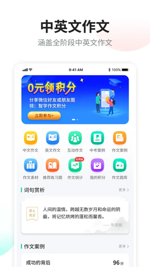 智学作文是一款作文批改、作文评分、作文纸条和作文讲解的作文辅导软件,拥有强大的作文素材和满分高考作文范文。 软件内置不同作文文体的判分细则和判分标准,采用名师作文判分标准;作文内容上涵盖了叙事记叙文、写人记叙文、写景记叙文、想象记叙文、议论文、事理说明文、事物说明文、演讲稿、读后感、观后感、应用文、书信、散文等所有类型的作文。 作文辅导软件内拥有多达几万篇以上的作文题库,有材料作文、半命题作文、命题作文、话题作文等多种作文题目,还可查看作文范文、作文李和作文作文解析。