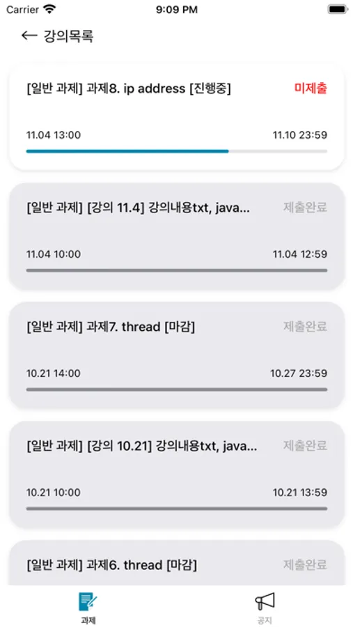 자신의 수강 과목을 확인할 수 있으며, 해당 과목의 과제와 공지 정보를 한눈에 확인할 수 있습니다.