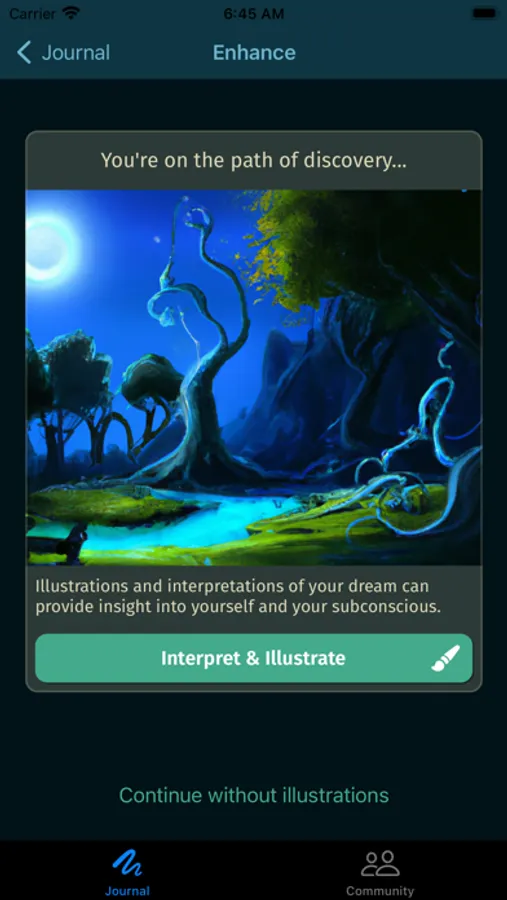 Get the complete dream journaling experience with the Dream Illustrations subscription. This allows you to get illustrations and detailed interpretations for each dream you add to your dream journal.