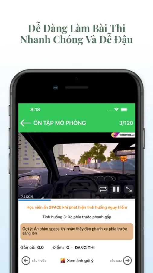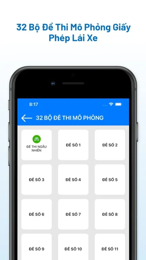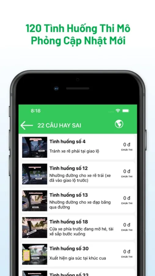 ứng dụng gồm 120 tình huống thi mô phỏng với 32 bộ đề thi cập nhật mới.