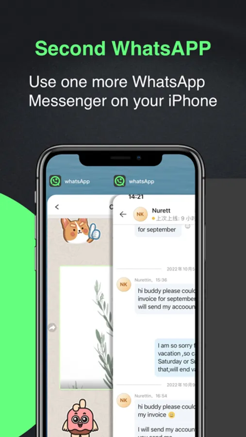 Download “2nd Chat for WA Messenger",you can actively use 2 WhatsApp accounts on your iPhone or you can use the same WhatsApp account on 2 devices. To connect, open the "2nd Chat for WA Messenger" app and you will see a QR code, simply 'scan' this code using WhatsApp on your phone and you will be logged in. You will find this option within WhatsApp settings on your phone, at "WhatsApp Web" menu.