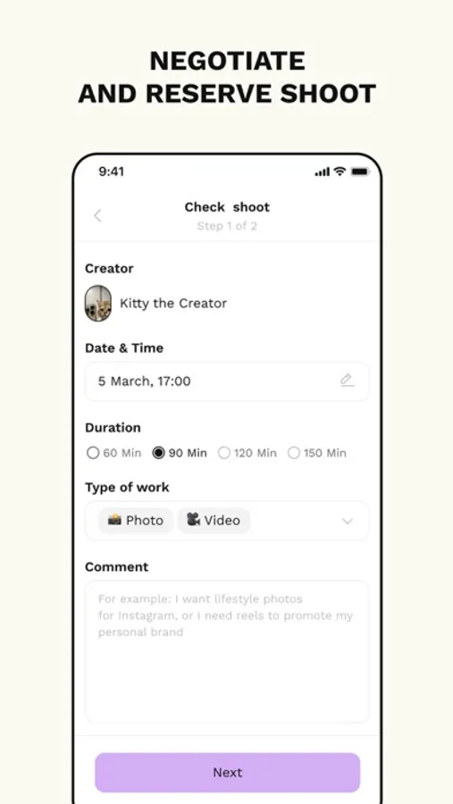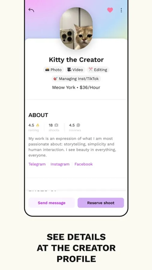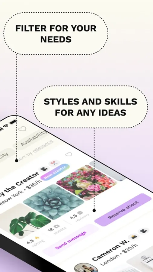 If you are a user, register in the app, filter for your needs, and find «that one» creator. Our carefully vetted creators will find a beautiful location, highlight your best angle and help to relax.