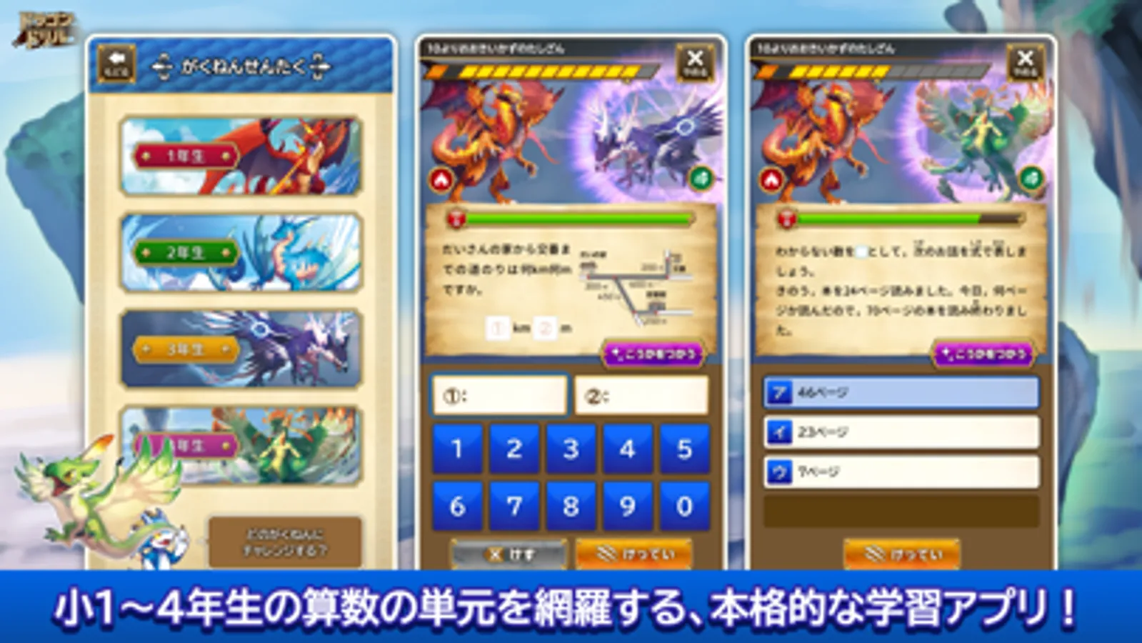 算数の問題を解きながらドラゴンバトルを進め、ドラゴンずかんを完成させよう!