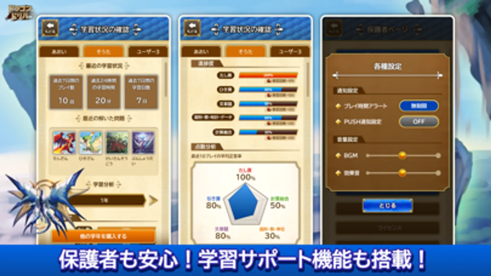 保護者向けの管理機能で、お子さまの学習状況を確認することができるので安心です。