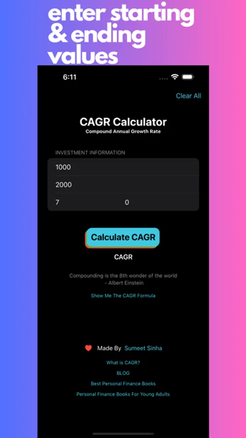 CAGR Calculator app allows you to compute the compound annual growth rate (CAGR) of your investments. Whether you're a seasoned investor or just starting your financial journey, this handy tool will help you make informed decisions by accurately calculating the growth rate of investments over a specified time period.