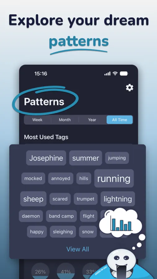 The more dream logs you create, the more detailed your dream patterns will become. Patterns show what you dream about and how you felt in most of the dreams.