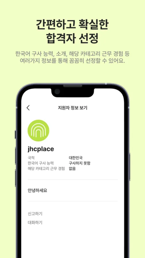 쉽고 빠른 일자리 게시, 막힘없는 대화, 간편하고 확실한 합격자 선정.