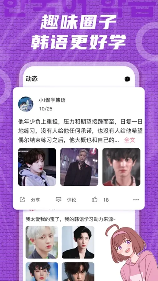 聚趣韩语专为韩语爱好者量身打造的韩语学习助手软件。搭配每日一练,TOPIK1~6级词汇记忆工具,可以帮助韩语零基础学习者高效学习韩语,还有更多免费入门课程,让你快速入门,零基础轻松学韩语。