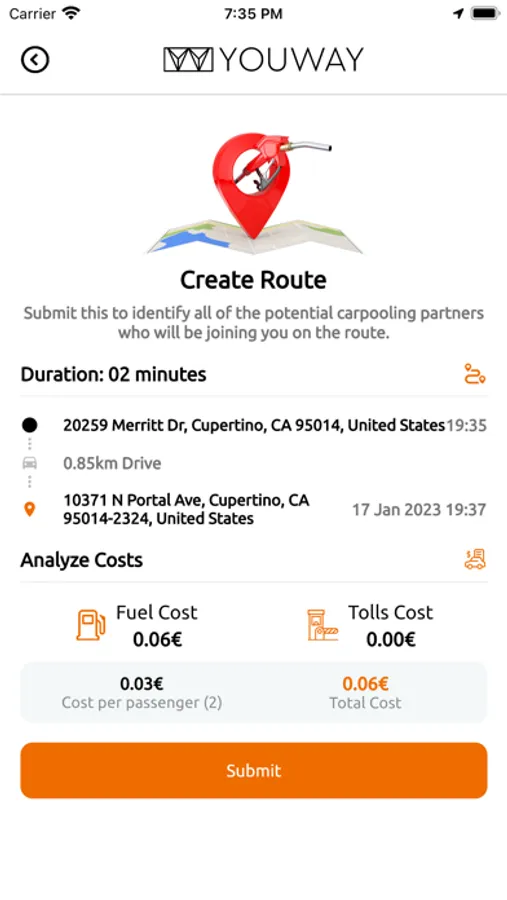 You can share your routes and find more than one person that travels in the same location. By having more people using one vehicle, YouWay reduces each person's travel costs such as: fuel costs, tolls, and the stress of driving.