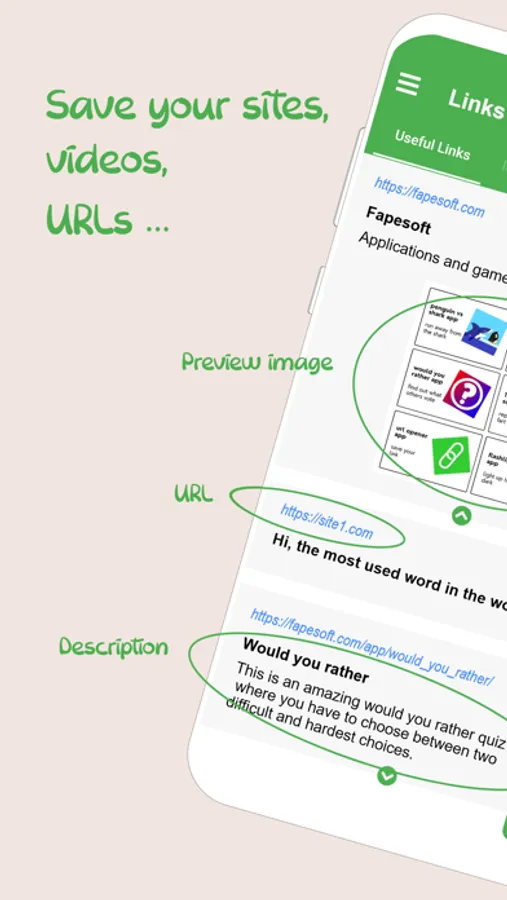 Save your favorite sites, music video links, news videos, text pages, article urls.