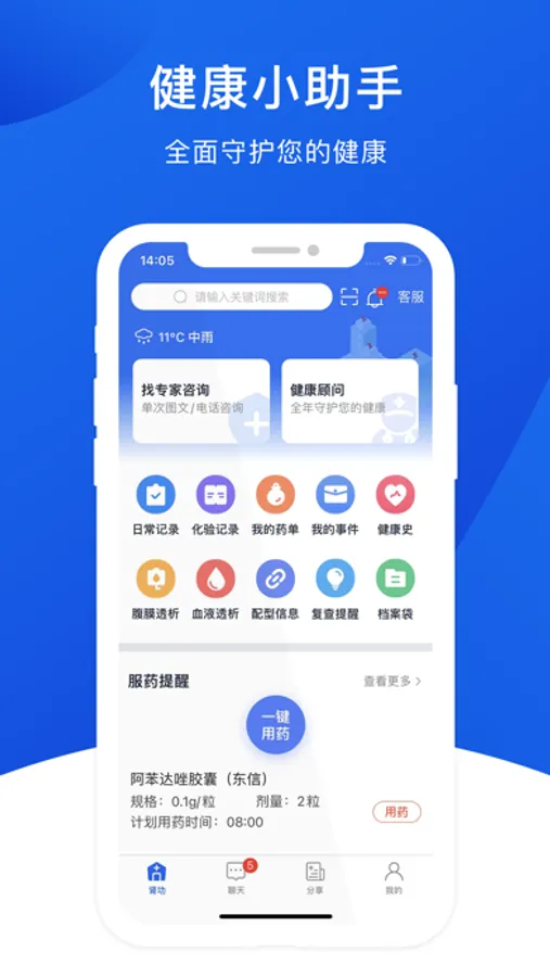记录健康:录入血压、心率、体重、尿量等信息,系统形成变化趋势,供自己和医生参考