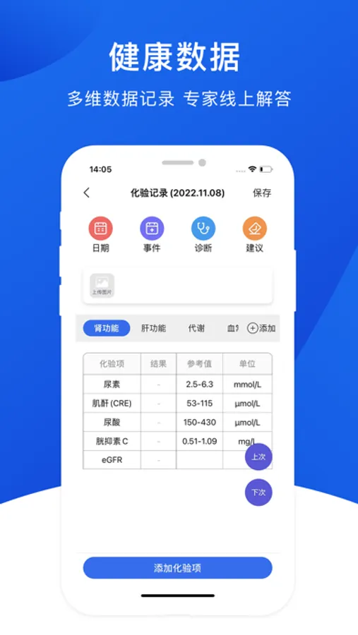 云端保存化验记录:录入以往做过的检查及化验数据,系统会进行统计分析,形成曲线、列表,直观看到变化趋势图