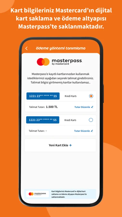 Birden fazla kredi kartı ekleyebilir ve tercih ettiğiniz kredi kartınızı önceliklendirilebilirsiniz. Aracınıza tanımlayacağınız limitler dahilinde yakıt alımlarınızı kontrol edebilirsiniz.