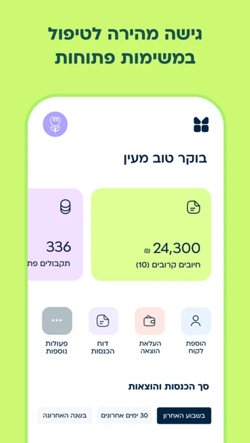 אפליקציית morning, לשעבר חשבונית ירוקה, מאפשרת לעצמאיות ועצמאים ליהנות ממערכת ניהול העסק הנוחה שלנו גם מהנייד. זה אומר שאפשר לנהל את העסק מהכיס ולבצע את הפעולות המוכרות מהמערכת: חשבוניות, דוחות, קבלת תשלום, ניהול הוצאות ועוד בכל זמן ומכל מקום.