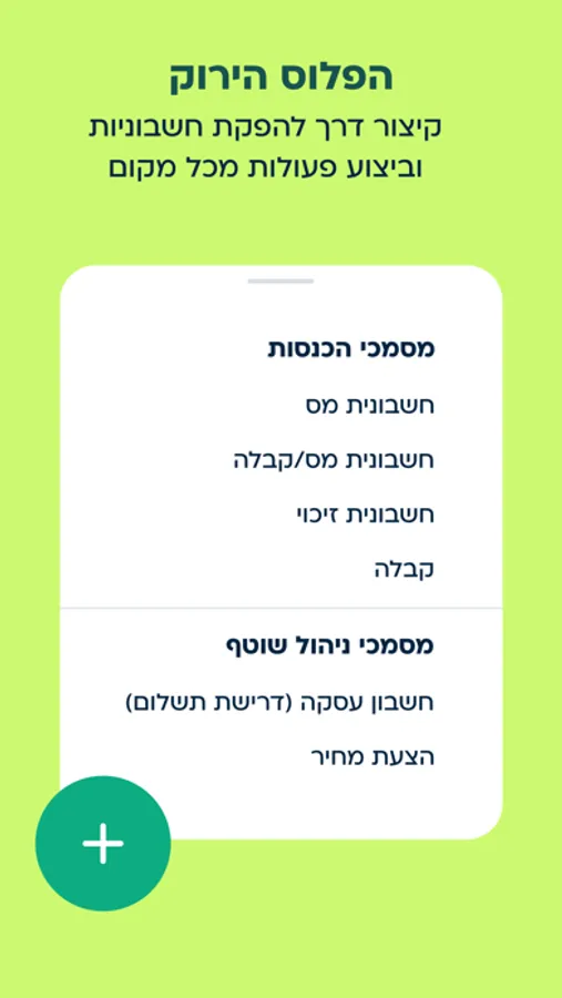 * גמישות מקסימלית מול הלקוחות עם הפקת חשבונית ירוקה, קבלות, דרישת תשלום ושאר המסמכים ישירות מהנייד, בלי תלות בלפטופ או המחשב במשרד.