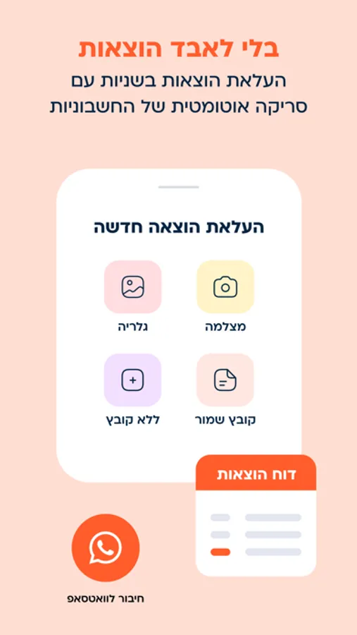 * ניהול הוצאות אידיאלי עם אפשרות לצלם ולהעלות חשבוניות על הוצאות בשניות בדיוק ברגע שהן מתרחשות, כדי לא לאבד אף הוצאה בדרך ולחסוך מקסימום כסף לעסק.
