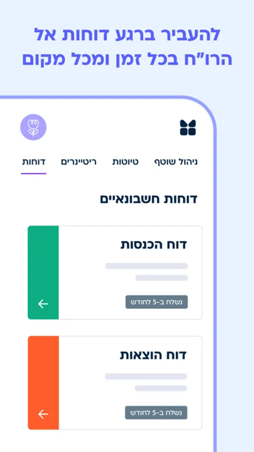 * עבודה יעילה יותר מול הרו״ח עם הפקה ושליחה של דוח הוצאות ודוח הכנסות.