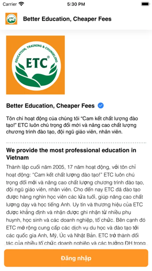 Thành lập cuối năm 2005, 17 năm hoạt động, với tôn chỉ hoạt động: “Cam kết chất lượng đào tạo!” ETC luôn chú trọng đổi mới và nâng cao chất lượng. Uy tín và thương hiệu của ETC được khẳng định và nhận được ghi nhận. Bên cạnh đó ETC mở rộng cung cấp các dịch vụ du học và đào tạo tới các quốc gia Anh, Mỹ, Úc và Nhật Bản. ETC trở thành đối tác của nhiều tổ chức doanh nghiệp và các trường ĐH trong và ngoài nước: British Council, IDP, Vienam Airlines (các công ty trực thuộc), Tập đoàn Dầu khí, các Ngân hàng, Portland University (USA), University of Bedfordshire (England), University of th West of England, các trường đào tạo Nhật ngữ, Cao đẳng, Đại học tại Nhật Bản….