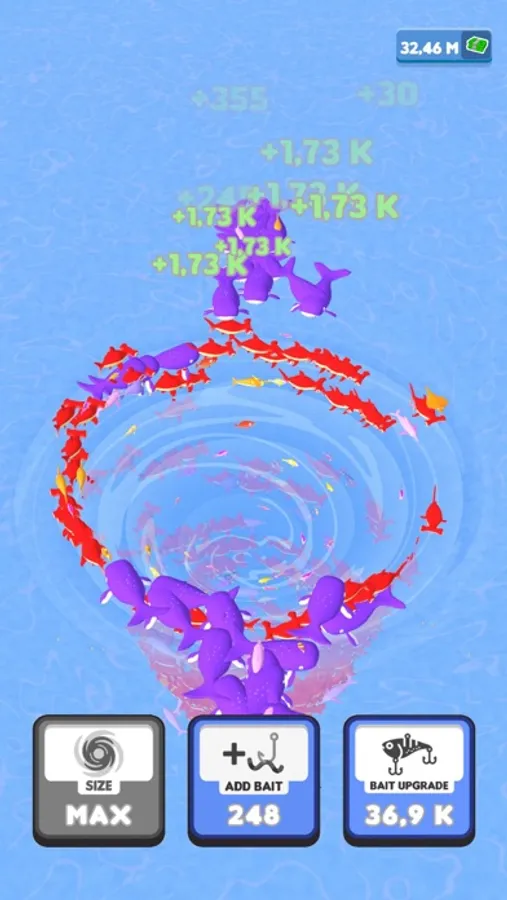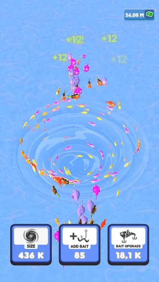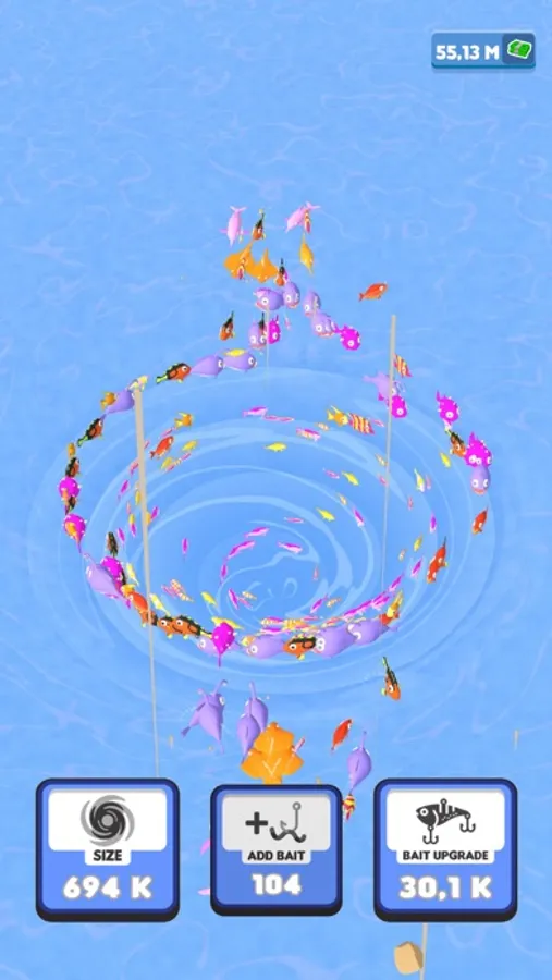 Time to go fishing! But this is no normal fishing we are doing here. We are using a whirlpool to catch the fish! Up the size of your whirlpool. Use baits to lure more fish in! Upgrade your baits to get bigger fish to come towards your whirlpool! You will make insane amounts of money! Let's get fishin'!