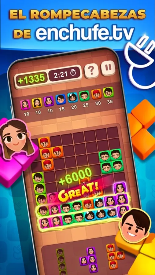 Dive into the exhilarating world of block puzzles with the official Enchufe TV puzzle game! In this thrilling new adventure, you'll tackle challenges packed with geometric blocks of various shapes and sizes, similar to those in classic puzzle games, but with your favorite characters.