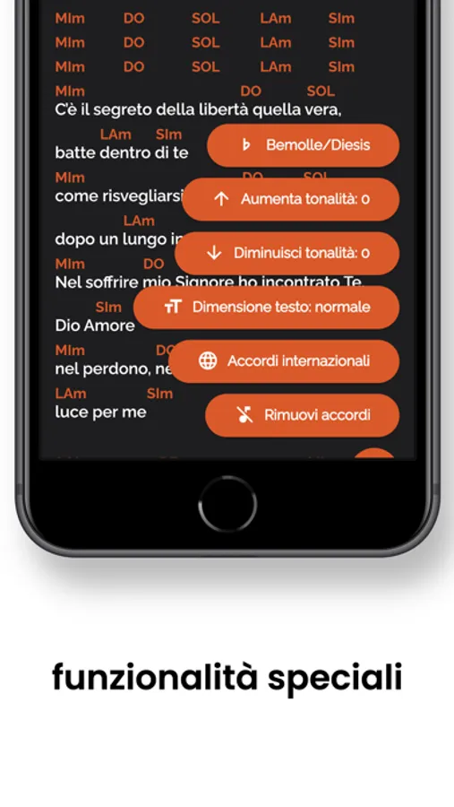 È possibile visualizzare le canzoni con o senza accordi e gli accordi con varie nomenclature.