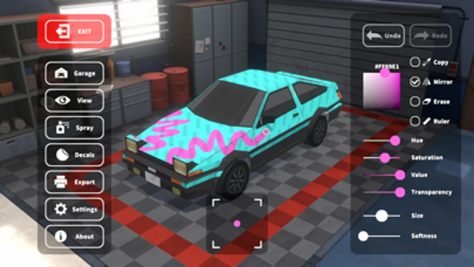 - Spray: freely spray the vehicle through a spray gun. Various tools are available for selecting colors, copying colors, mirroring, erasing colors, and drawing straight lines.