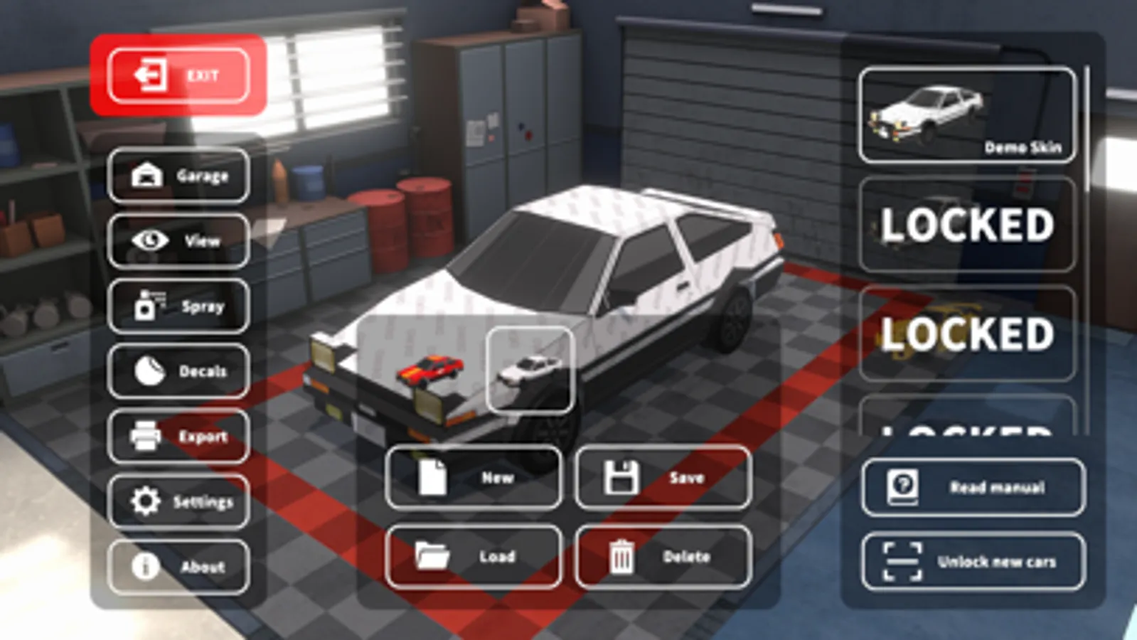 - Garage: scan collectible cards to unlock new car models; read online assembly manuals for the unlocked models; use the paint job manager to create, save, load, or delete paint jobs.