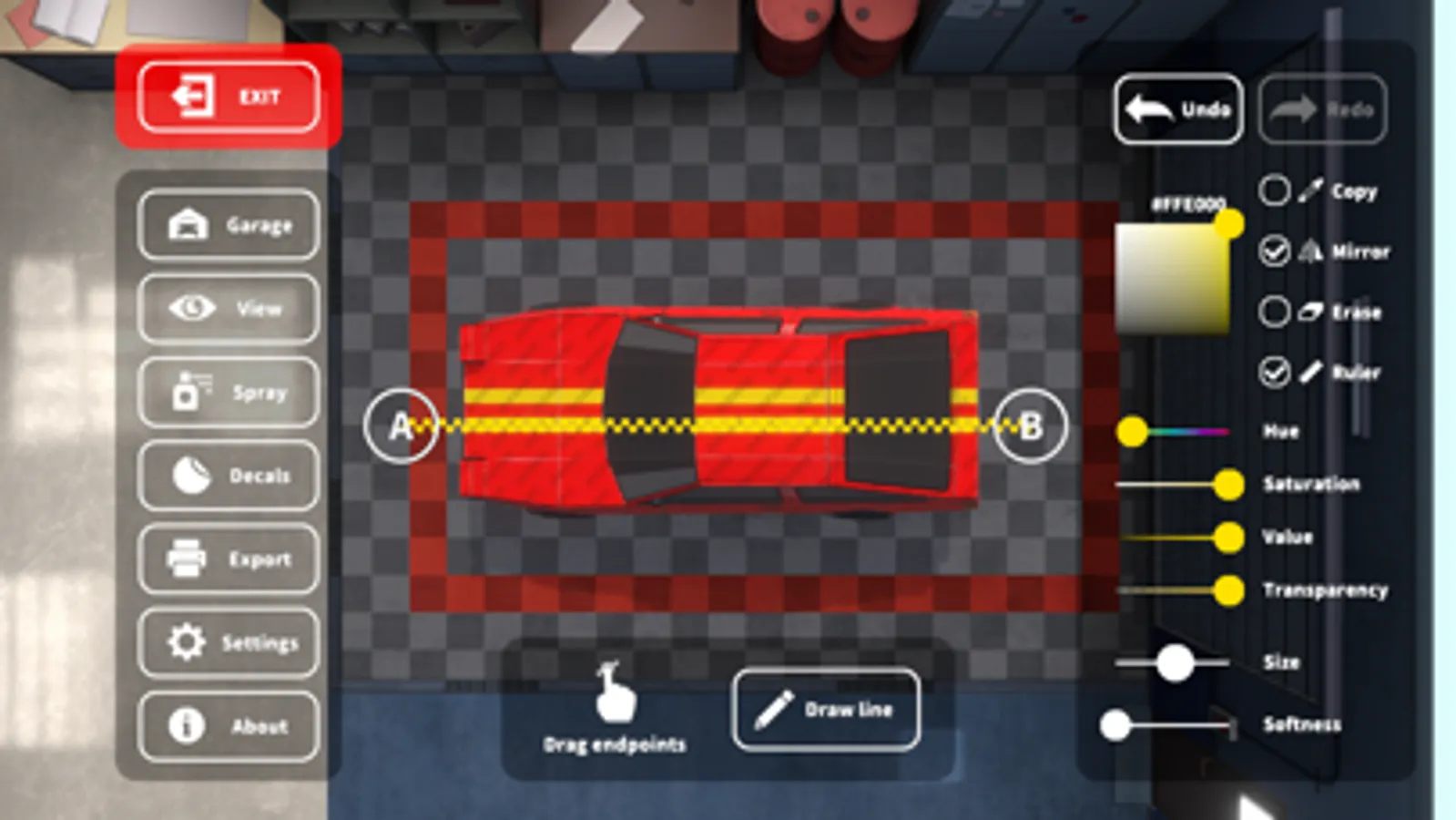 - Decals: apply custom text, album photos, numbers, and national or regional flags to the car body. Various tools are available for changing decal color, copying color, mirroring, and erasing decals.