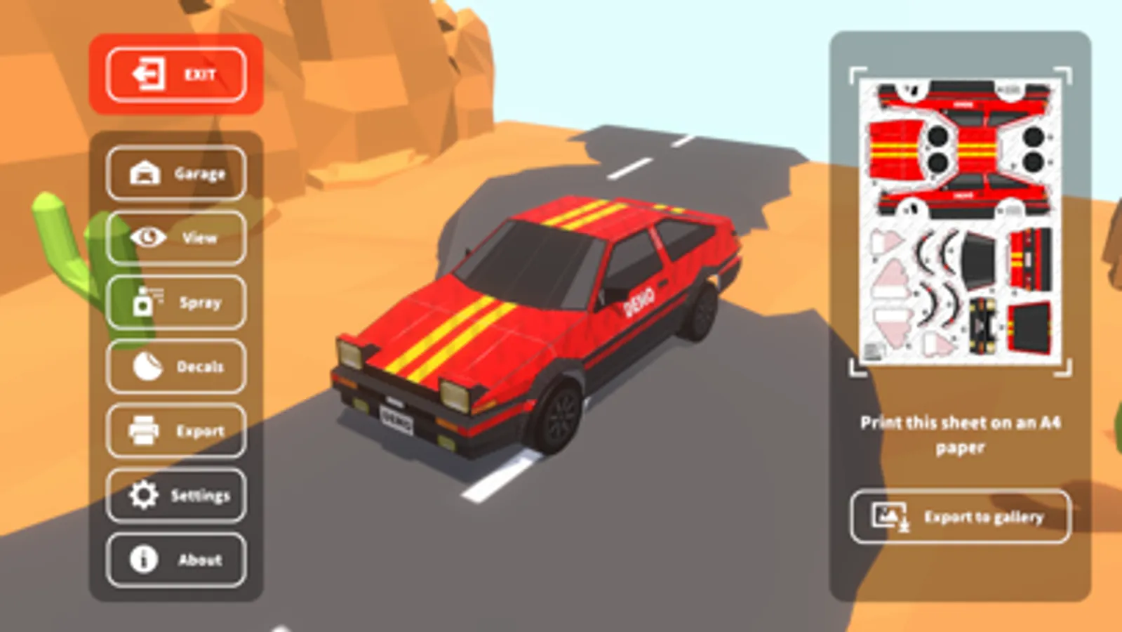 - Export: convert your 3D paint job into an unfolded component sheet and export it to the device album. You can print it on an A4 size paper to build a 3D papercraft car body.