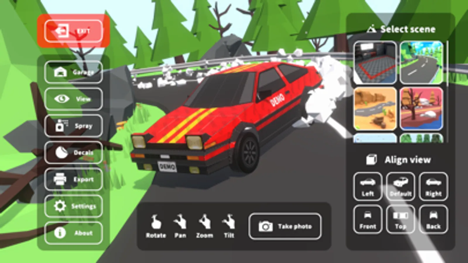 - View: preview your paint jobs and take screenshots in 8 different 3D scenes. Custom photo or camera image can be used as background.