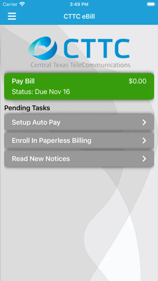 CTTC's eBill mobile app provides access to your Central Texas eBill account allowing you to make payments, view usage, and review invoices right on your mobile device. Forget the hassle of in-store payments and set up autopayments for safe, easy payments to your account. Log in using your existing CTTC eBill online username and password or, if you are a new user or don't have an account, simply use your latest invoice to register and set up your eBill account. For additional help concerning your eBill account, contact our customer service representatives during office hours. Download the CTTC eBill mobile app today for faster, secure access to your billing account.