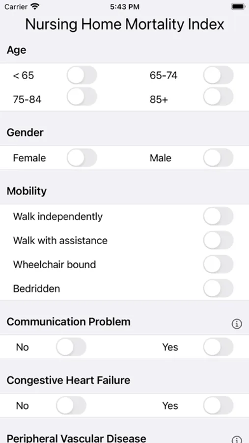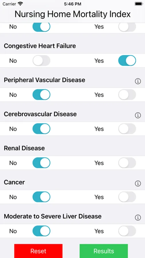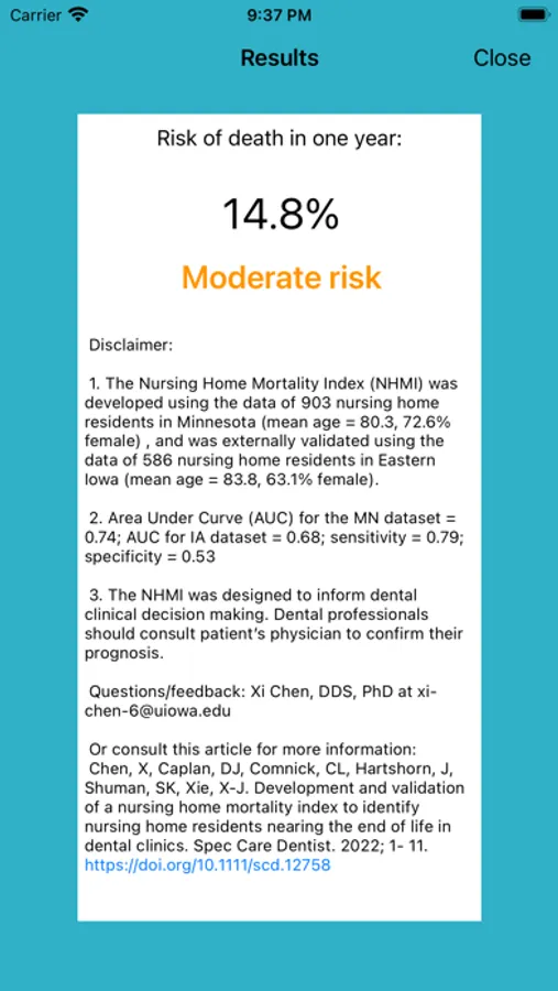 The NHMI app was designed to help clinicians better understand their patients' needs and guide treatment planning for older patients. To use this app, simply select the patient's criteria for each category and press "Results". The estimated probability of death in the next 12 months will appear on the screen with a low, moderate, or high risk classification. To clear all criteria selections, press the "Results" button. For more information about the categories, select the information icon to the right of the category title. Tap the link at the bottom of the results page to open the article referenced in this application.