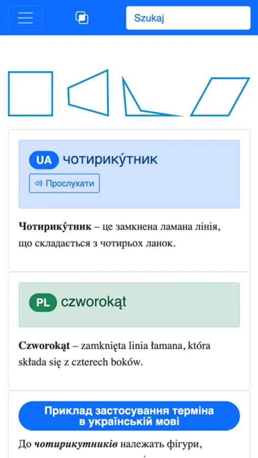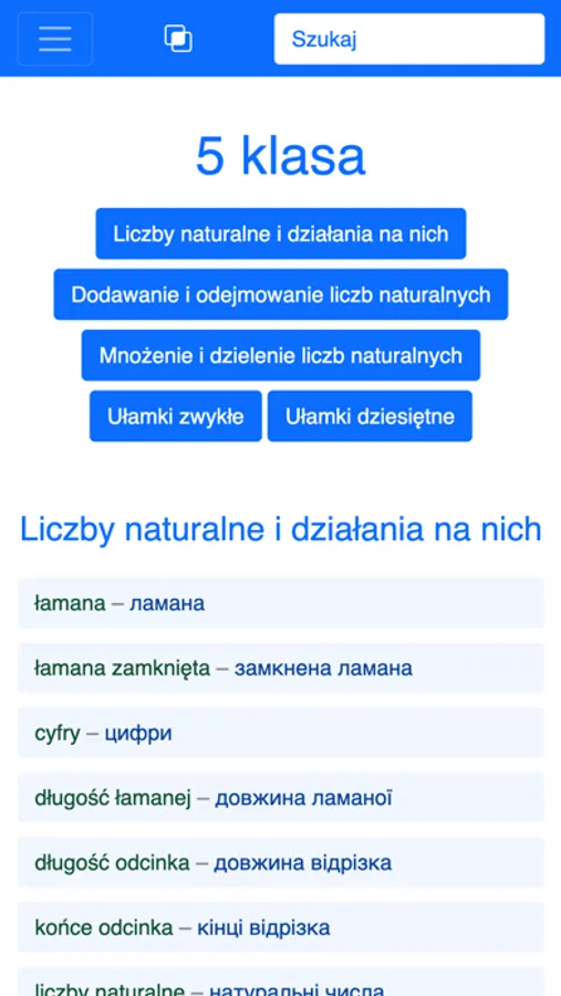 W słowniku możesz wyszukiwać terminy zarówno w języku polskim, jak i ukraińskim. Może być używany indywidualnie podczas prac domowych oraz jako dodatkowy materiał na lekcjach matematyki.